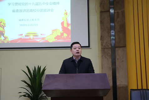 【本网讯】根据省委教育工委的统一部署,11月23日上午,学习贯彻党的十九届五中全会精神省委宣讲团高校分团走进新莆京3969航空港校区。省委宣讲团成员、四川省社会科学院副院长郑泰安研究员就党的十九届五中全会精神进行了深入宣讲。学校师生代表近300人到场聆听,宣讲会由省纪委监委驻校纪检监察组组长、学校党委副书记、纪委书记雷超主持。
