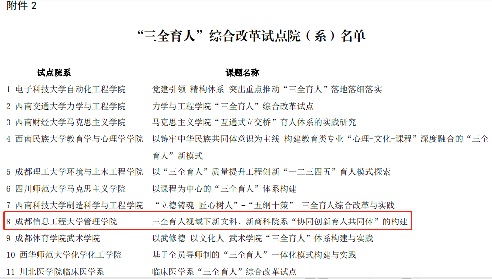 【本网讯】近日,根据《中共四川省委教育工作委员会关于公布“三全育人”综合改革试点高校和试点院(系)评选结果的通知》(川教工委函〔2020〕73 号),新莆京官网管理学院申报的《三全育人视域下新文科、新商科院系“协同创新育人共同体”的构建》 获批“三全育人”综合改革试点院(系)立项。