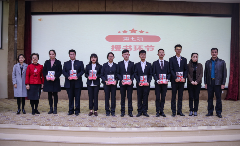 马克思主义学院周晶晶老师、青马学习研究会理论学习部部长刘洪宾同学分别作为“青年马克思主义学习研究会”指导教师、学员代表发言。与会老师和领导为西航港街道和学校学生代表授书。