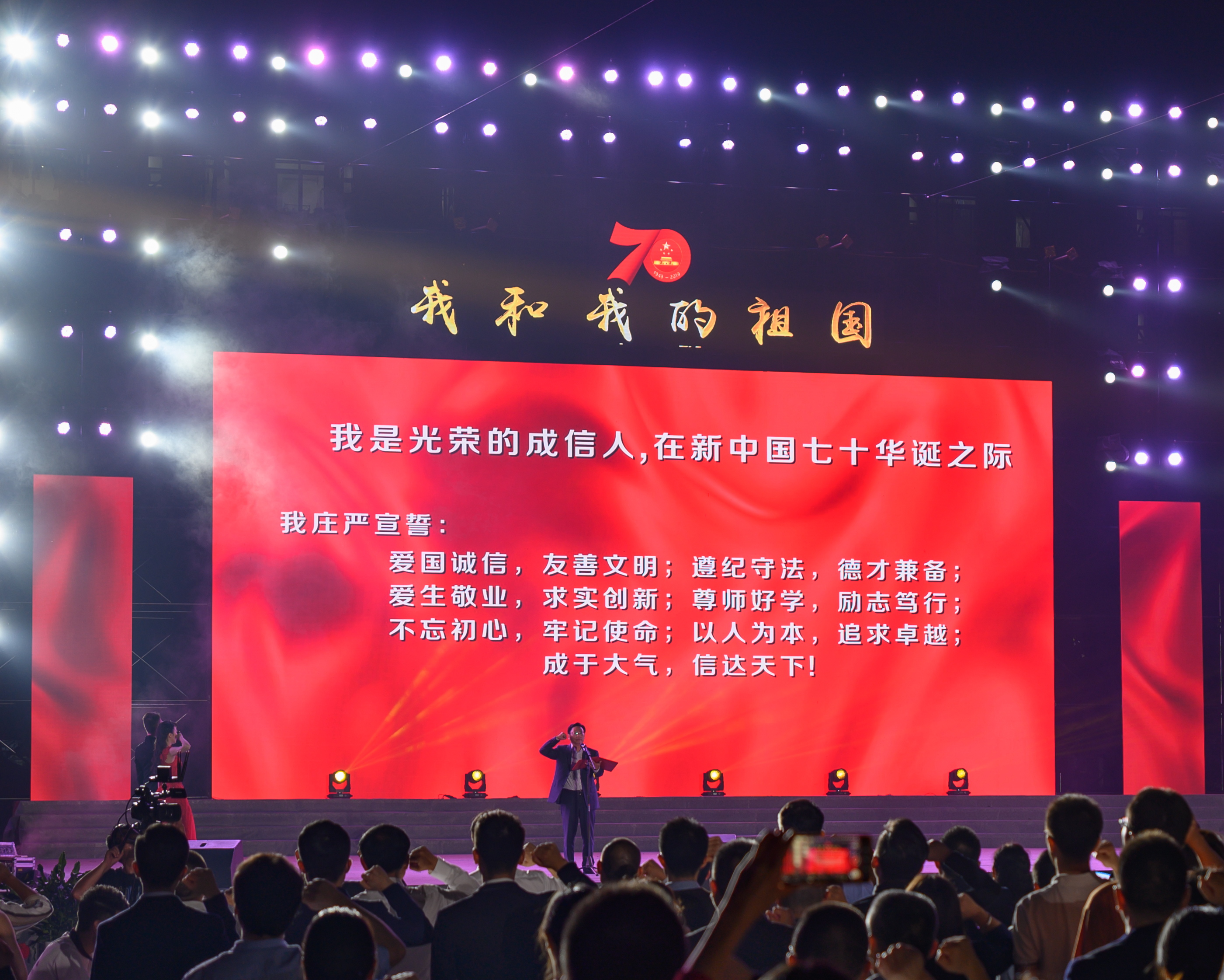 晚会现场,学校党委副书记马洪江领誓,全体师生庄严宣誓:“爱国诚信,友善文明;遵纪守法,德才兼备;爱生敬业,求实创新;尊师好学,励志笃行;不忘初心、牢记使命;以人为本,追求卓越;成于大气,信达天下!”