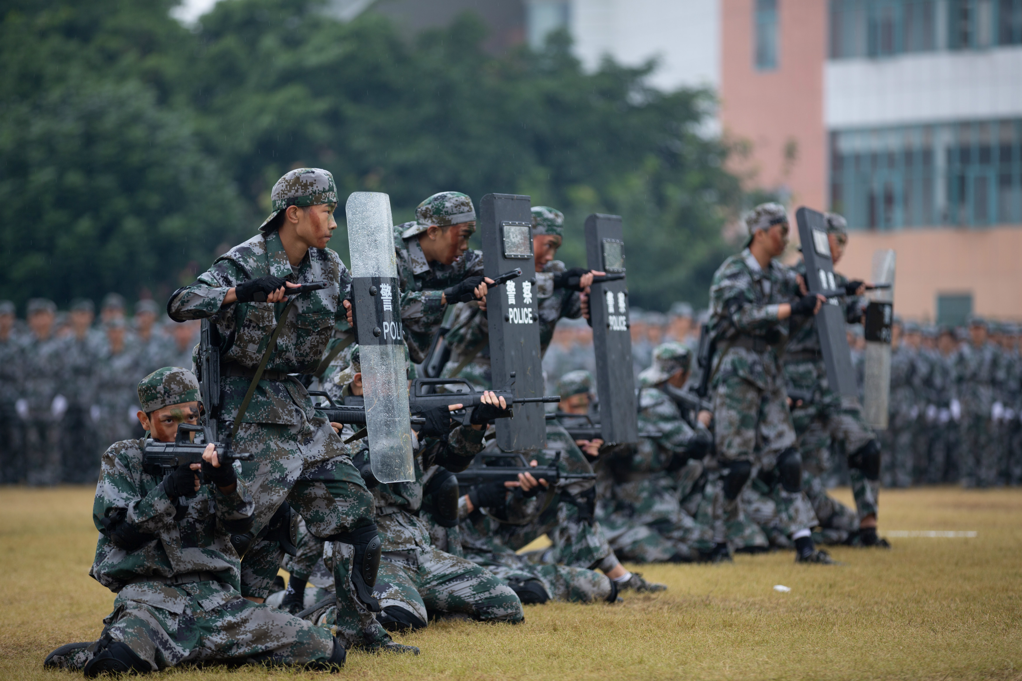 现场举行了庄严的升国旗仪式。伴随着雄壮的国歌声,2019级参训新生们身着迷彩服,向着冉冉升起的国旗行注目礼。