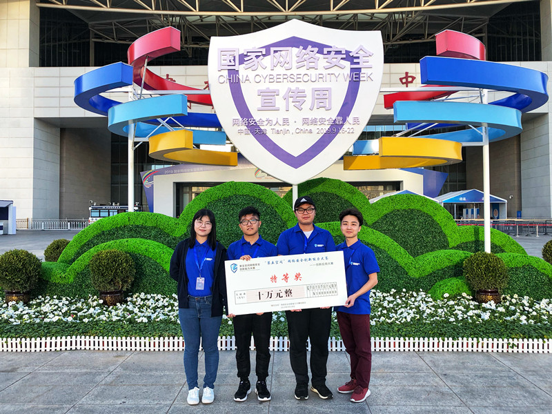 【本网讯】作为2019年国家网络安全宣传周重要活动之一,由天津市委网信办、中国网络空间安全协会、滨海新区政府主办,南开大学、天津大学、天津理工大学承办的第五空间网络安全创新能力大赛决赛9月18日在天津梅江会展中心举行。新莆京官网网络空间安全学院 “道格安全小组”成员彭玉轩、康浩荣、曾春浩、周晓燕四名同学组成的参赛队伍取得“创新应用大赛”全国总决赛特等奖,奖金10万元。