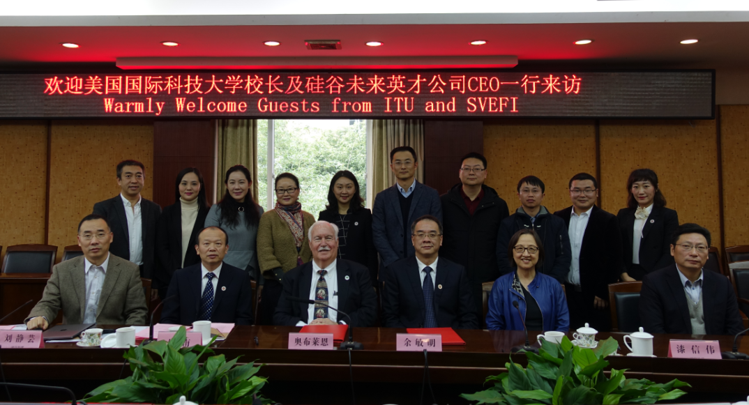 【本网讯】11月14日,美国国际科技大学(International Technology University)校长O’Brein、电子与计算机工程系主任May Huang、硅谷未来英才公司CEO钟南一行来校交流访问。学校校长余敏明,党委副书记马洪江、副校长何建新,相关职能部门和学院负责人参加了合作交流会议。会议由何建新主持。