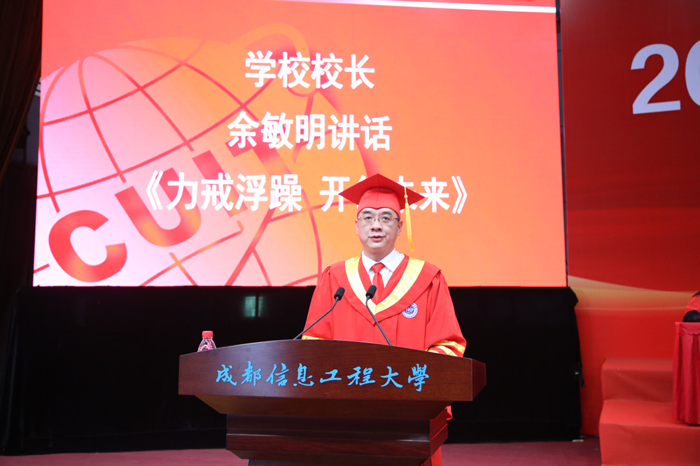 余敏明寄语毕业生:力戒浮躁,开创未来。他指出,只有力戒浮躁,才能看清未来,具备应对挑战的强大力量,增强面对挫折的勇气和韧性,激发实现梦想的无限活力和潜力;只有力戒浮躁,才能开创未来,才能耐得住寂寞,以足够的耐心和恒心,把热爱的事情踏踏实实地坚持下去,日积月累,坚持不懈,最终开创出广阔的一片天。