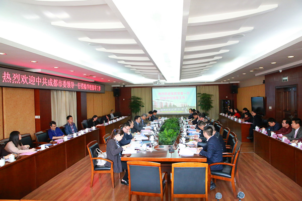 【本网讯】3月19日下午,中共成都市委常委、市总工会主席吴凯率市经信委、市科技局、市新经济委、成都国际铁路港及龙泉驿区、青白江区、双流区政府相关负责同志来校调研校院企与产业功能区及园区深度融合发展情况。学校校长余敏明,副校长马洪江、何建新参加了调研座谈。座谈会由何建新主持。