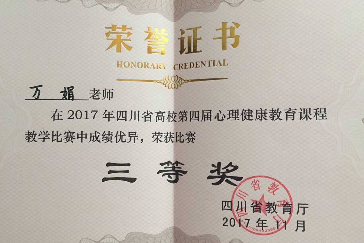 【本网讯】11月17日,第四届四川省高校心理健康教育课程教学比赛在四川旅游学院举行。新莆京官网软件工程学院辅导员万娟老师荣获比赛三等奖。