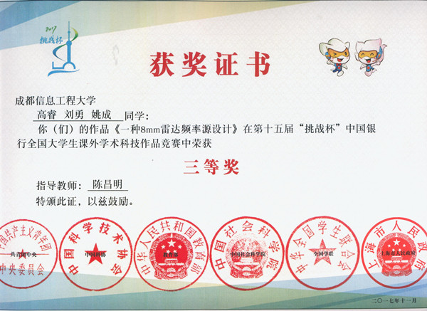 【本网讯】11月14日至19日,由共青团中央、中国科协、教育部、中国社会科学院、全国学联和上海市政府主办,上海大学承办的第十五届“挑战杯”全国大学生课外学术科技作品竞赛终审决赛在上海大学宝山校区举行。新莆京官网由通信工程学院陈昌明教授指导,高睿团队的作品《一种8mm雷达频率源设计》项目获得全国三等奖。