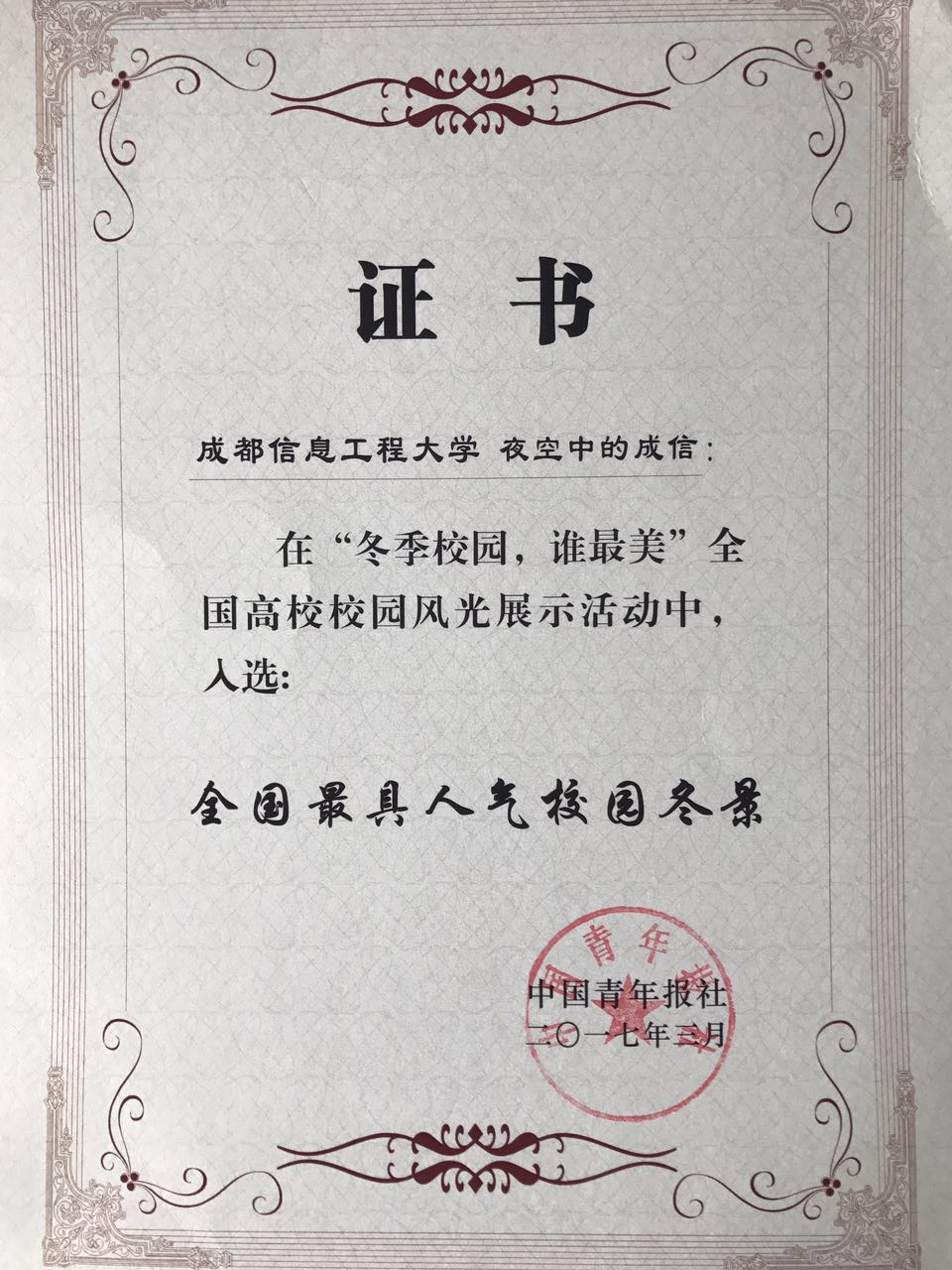 2016年12月,中国青年报社面向高校,发起“冬季校园,谁最美”高校校园风光展示活动,新莆京官网广大学生在校团委的组织下积极创作作品参与投稿,在中国青年报的微信公众号上展示了成信大冬季校园美景。此次入选的作品《夜空中的成信》,由新莆京官网学生张雪峰创作,他从俯视的角度拍摄,将校园建筑和环境与夜空及周边的整体环境有机融合,展现了夜幕降临,华灯初上时分成信大美丽的夜景,获得了活动主办方和网络受众的好评。