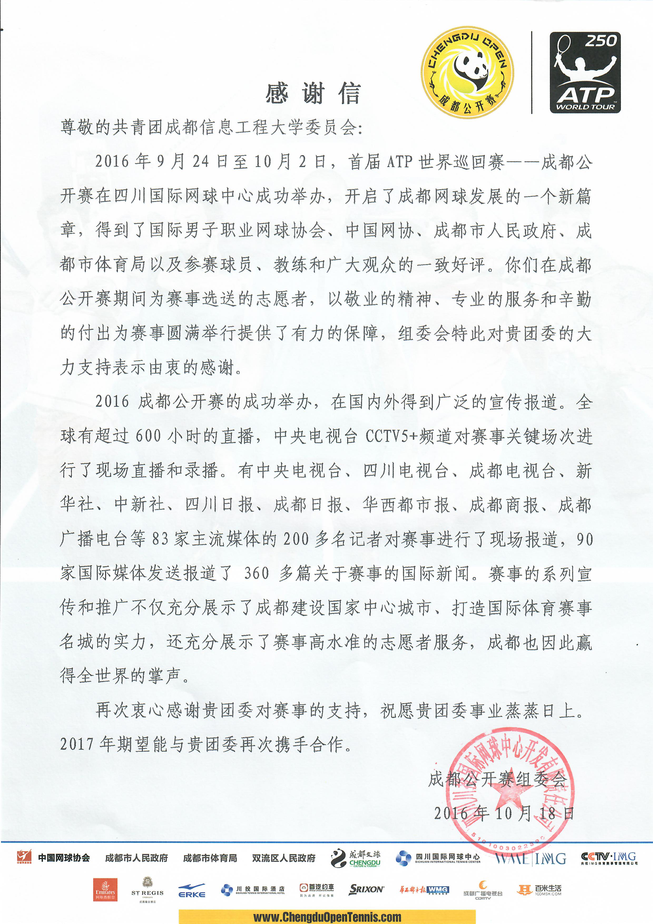 【本网讯】日前,首届ATP 世界巡回赛——成都公开赛组委会给新莆京官网发来感谢信,感谢新莆京官网为本届赛事的成功举办所提供的巨大帮助和支持,向新莆京官网参与赛事服务的志愿者们表达崇高的敬意和由衷的感谢,并对新莆京官网高效、规范、专业的志愿服务组织工作以及志愿者们的突出表现给予了高度评价。