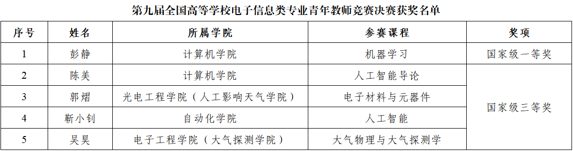 【本网讯】近期,由工业和信息化部教育与考试中心指导,教育部高等学校电子信息类专业教学指导委员会主办,长春理工大学承办的第九届全国高等学校电子信息类专业青年教师授课竞赛决赛在长春举行。经过激烈角逐,新莆京官网计算机学院彭静荣获全国一等奖,计算机学院陈美、光电工程学院郭熠、自动化学院靳小钊、电子工程学院吴昊荣获全国三等奖。学校荣获优秀组织奖。