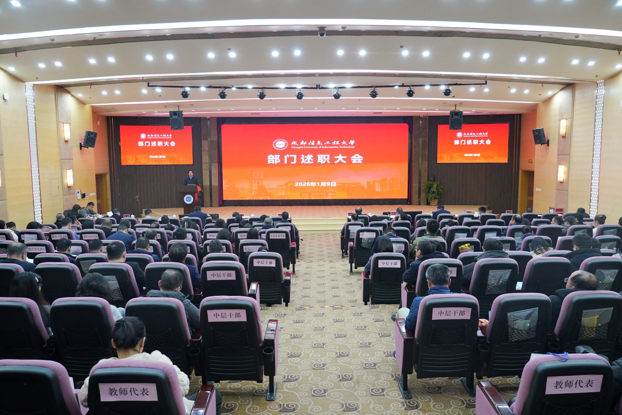 【本网讯】1月9日,学校在航空港校区国际会议厅召开2025年度部门述职大会,全面总结2025年度办学治校成效,系统研判发展形势,前瞻谋划2026年重点发力方向。全体校领导、中层干部、教代会主要负责人及教师代表共计200余人参加会议。会议由人事处处长杜国宏主持。
