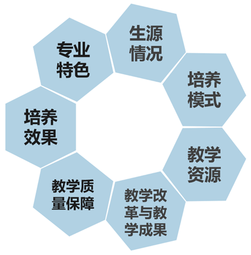 专业评估对标本科专业教学质量国家标准,坚持以学生为中心,在上一轮专业评估的基础上,根据政策导向,增加了教师教书育人和学生德育、体育方面的评价。采用定量评价与定性评价相结合的原则,评估指标包括生源情况、培养模式、教学资源、教学改革与教学成果、教学质量保障、培养效果、专业特色,7个一级指标,17个二级指标,41个观测点,其中31个定量评价观测点、10个定性评价观测点,另有一个定性评价报告。