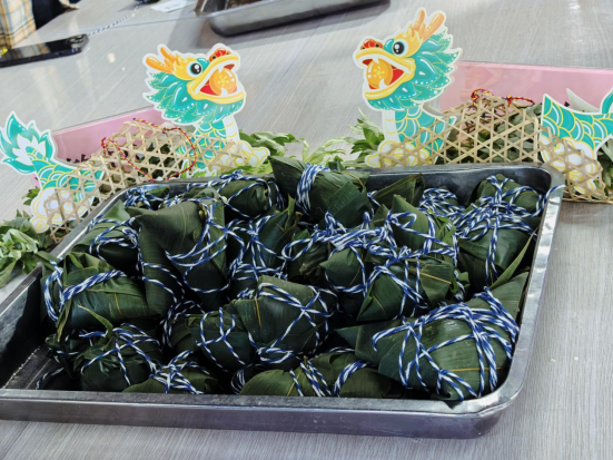 包粽子环节,食堂师傅提前准备好了粽叶、糯米和馅料,现场指导大家如何包粽子。同学们围桌学习粽叶卷叠、馅料填充、棉线捆扎等传统技法,粽叶与糯米的清香中交织着此起彼伏的欢笑声。“这个粽角要折得立体些”“馅料要裹紧才不会露馅”。同学们相互帮助,交流着包粽子的诀窍。经过近1个小时的蒸制,同学们品尝到了自己的劳动成果,飘散的香气和软糯的糯米让同学们体会到了家的温暖。
