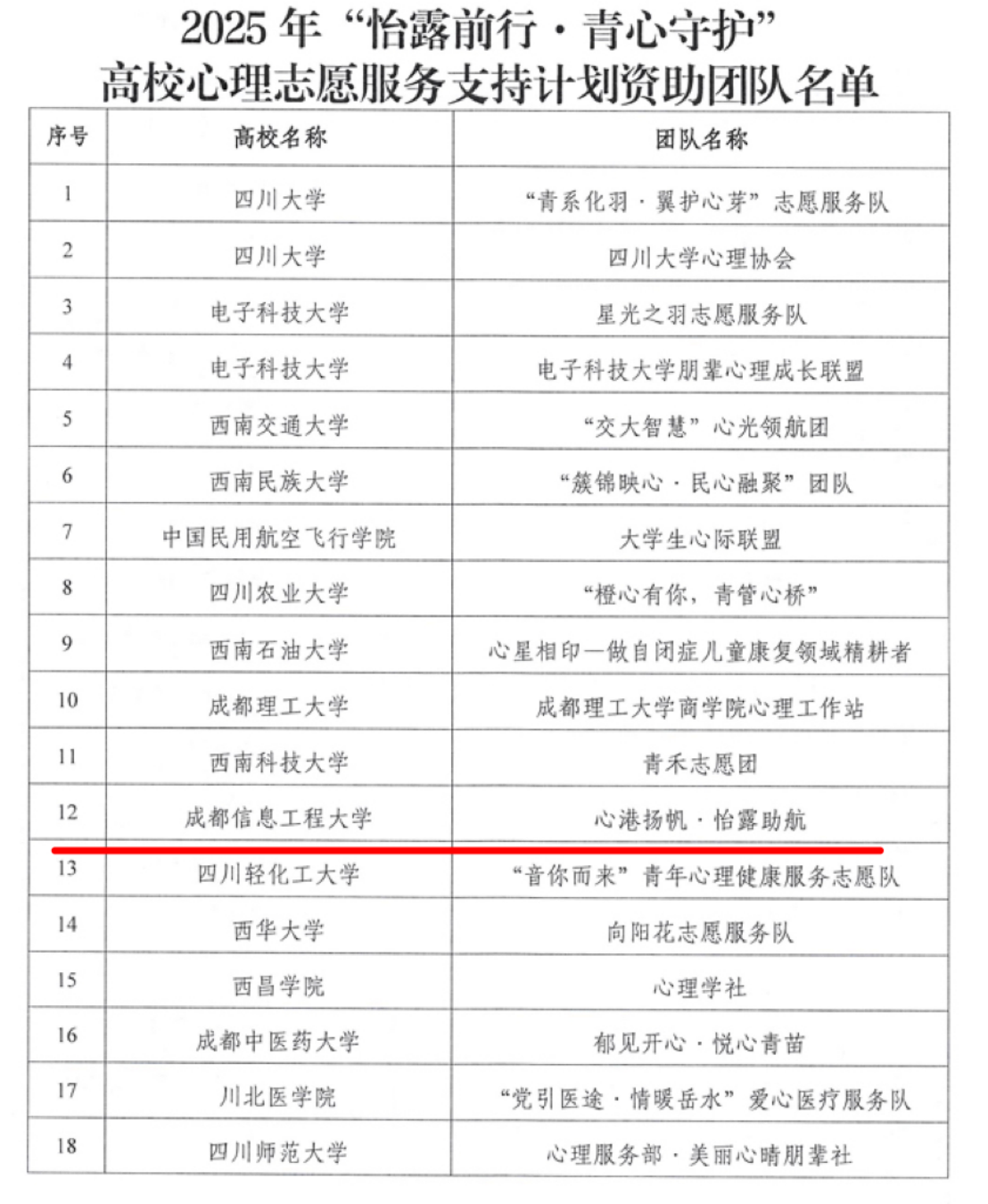 【本网讯】近日,四川省青少年发展基金会正式公布2025年“怡露前行·青心守护”高校心理志愿服务支持计划资助名单,新莆京官网“心港扬帆·怡露助航”志愿服务队从70所高校128支团队中脱颖而出,成功获得专项资助。