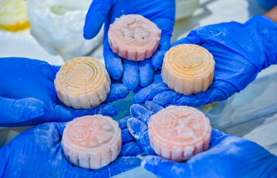 活动伊始,专业烘焙师傅为同学们详细讲解了冰皮月饼的制作流程。从原料配比、馅料包裹到模具压花,师傅一边示范一边强调注意事项:冰皮需保持适当湿度,收口时要捏紧防止露馅,压模之前需要抹上熟玉米淀粉,压模时力度要均匀,脱模时要慢速细致。在师傅的巧手演示下,一枚印着新莆京3969校徽的月饼便诞生了。