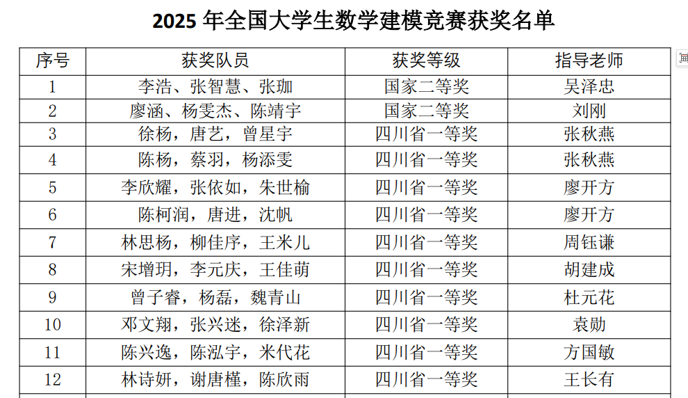 【本网讯】近日,2025年“高教社杯”全国大学生数学建模竞赛获奖名单正式公布。新莆京官网参赛学子凭借扎实的数学功底、出色的创新思维与卓越的团队协作能力,在比赛中表现优异,共荣获国家级二等奖2项,四川省一等奖10项、二等奖10项、三等奖20项(具体获奖名单详见附件),获奖数量与质量均位居省内省属高校前列,充分展现了新莆京官网学子的综合实力与精神风貌。