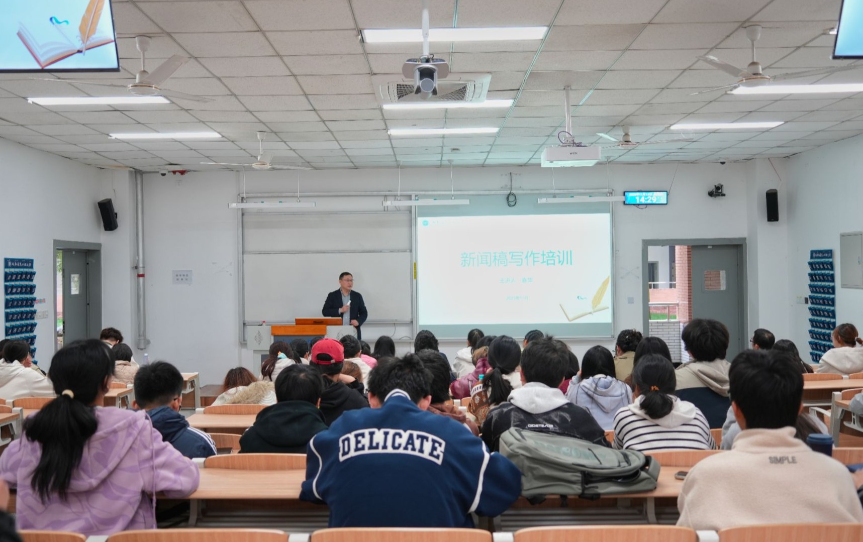 【本网讯】为进一步提升学校新闻宣传工作质量与传播效能,夯实新闻宣传队伍专业素质能力基础,11月13日下午,学校在航空港校区一教学楼1106教室举行新闻写作与摄影技能培训会。校内各单位负责新闻宣传工作的教师及学生骨干代表参加培训。培训会由党委宣传部副部长袁华主讲。