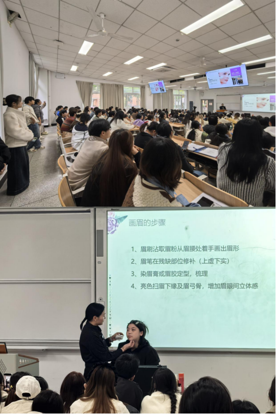 【本网讯】为积极推动学校第二课堂建设,深化美育工作成效,丰富学生的课余文化生活,帮助同学们塑造良好外在形象、提升内在气质与修养,展现青年学生积极自信的精神风貌,11月13日、20日和27日,党委学生工作部(学生发展中心)在航空港和龙泉校区举办了三场美妆课程,现场座无虚席。本次课程由国家高级化妆师、形象设计师和彩妆培训师刘丽荣老师主讲。两校区500余名本科学生开启了一场关于美的奇妙之旅。