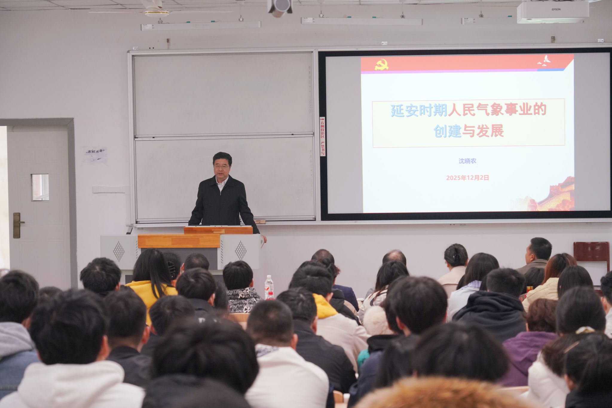 沈晓农以《延安时期人民气象事业的创建与发展》为题,紧密结合自身深厚的理论素养与丰富的实践经验,带领同学们回溯人民气象事业八十载不平凡的发展历程。他生动讲述了气象事业火种从延安播撒至全国的历史,系统阐释了在党的领导下,气象事业始终坚持以服务国家、服务人民为宗旨,实现从小到大、从弱到强的跨越式发展之路。他勉励在场学子,要牢记习近平总书记对气象工作的重要指示和殷切期望,胸怀“国之大者”,坚持人民至上、生命至上,自觉筑牢气象防灾减灾第一道防线;要传承延安精神,赓续红色血脉,追寻先辈足迹,努力成长为适应中国式现代化要求、可堪大用、能担重任的气象领域栋梁之材。