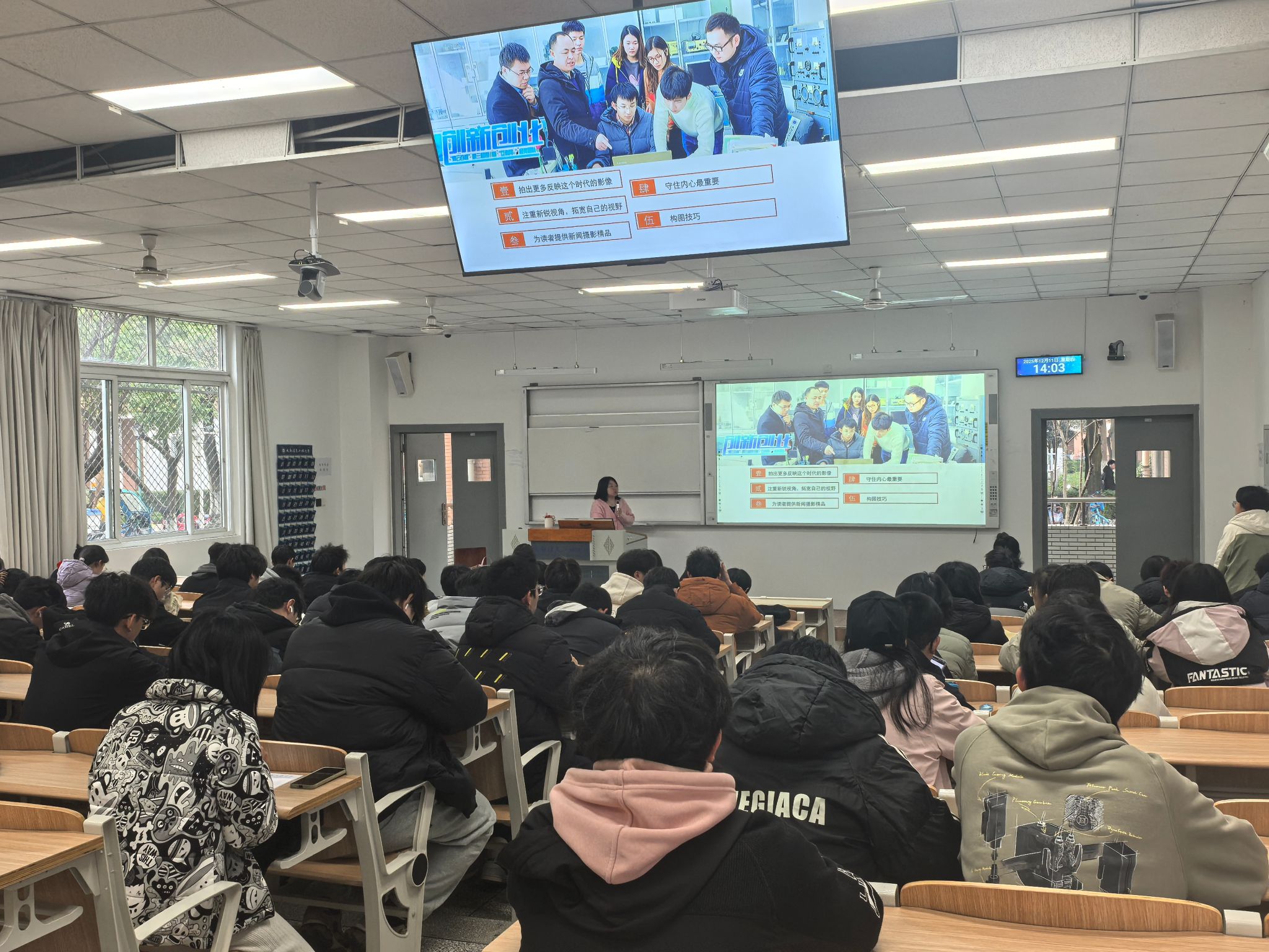侯倩以新华社等国家主流媒体的新闻照片为切入点,结合摄影记者们的实战经验,分享了构图技巧等方面的知识,详细介绍了25个构图小技巧,让同学们对摄影构图有了更深入的理解。她结合校内同学们实际拍摄的一些会议和活动场景进行了实例点评,选取了一些同学们拍摄的照片,从构图、光线及色彩等方面进行了详细的分析和指导,并介绍了校园活动不同场景的常用拍照出片点位,让同学们对学术讲座、体育比赛、文艺演出等校园活动的拍摄有了更清晰的思路和方法。
