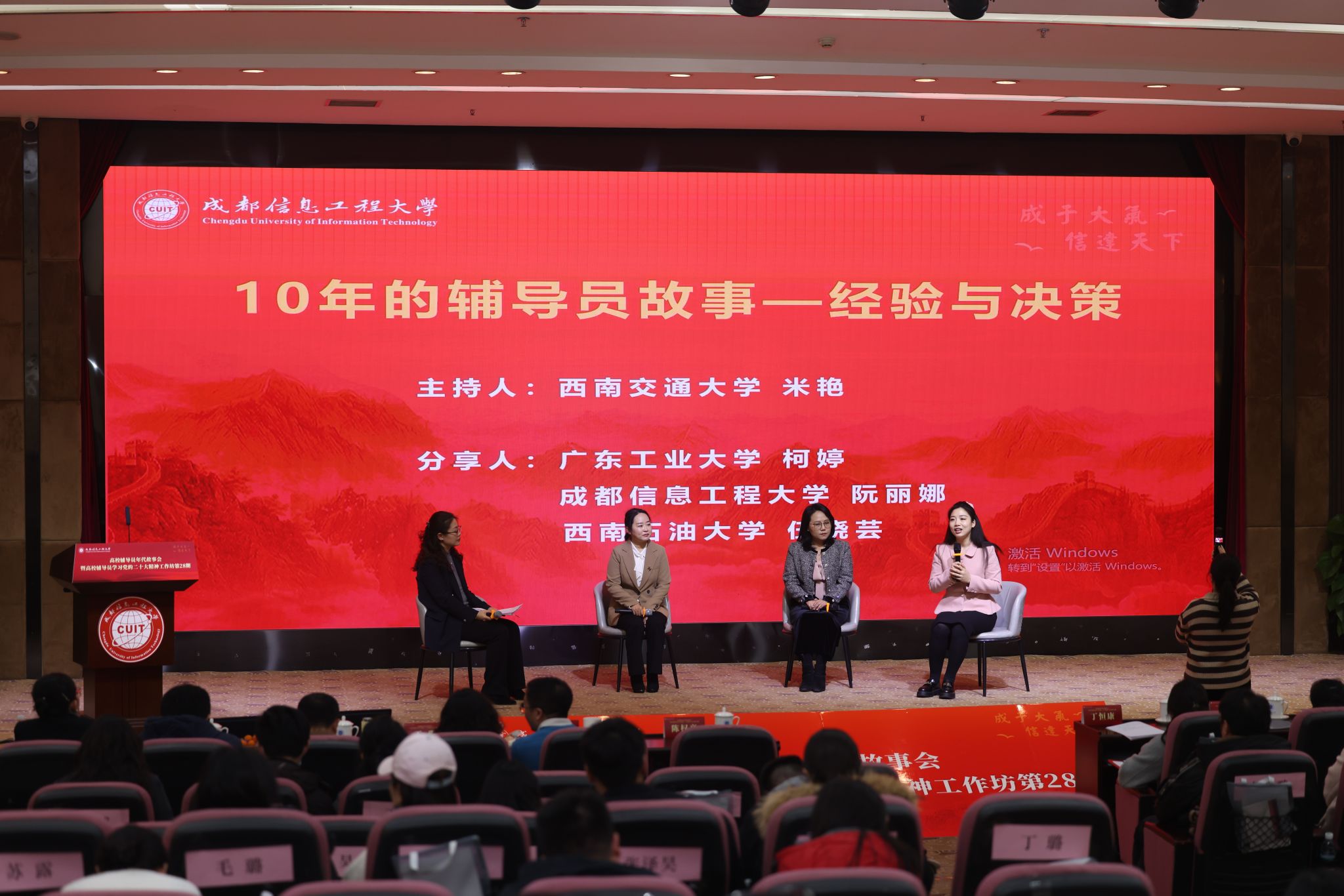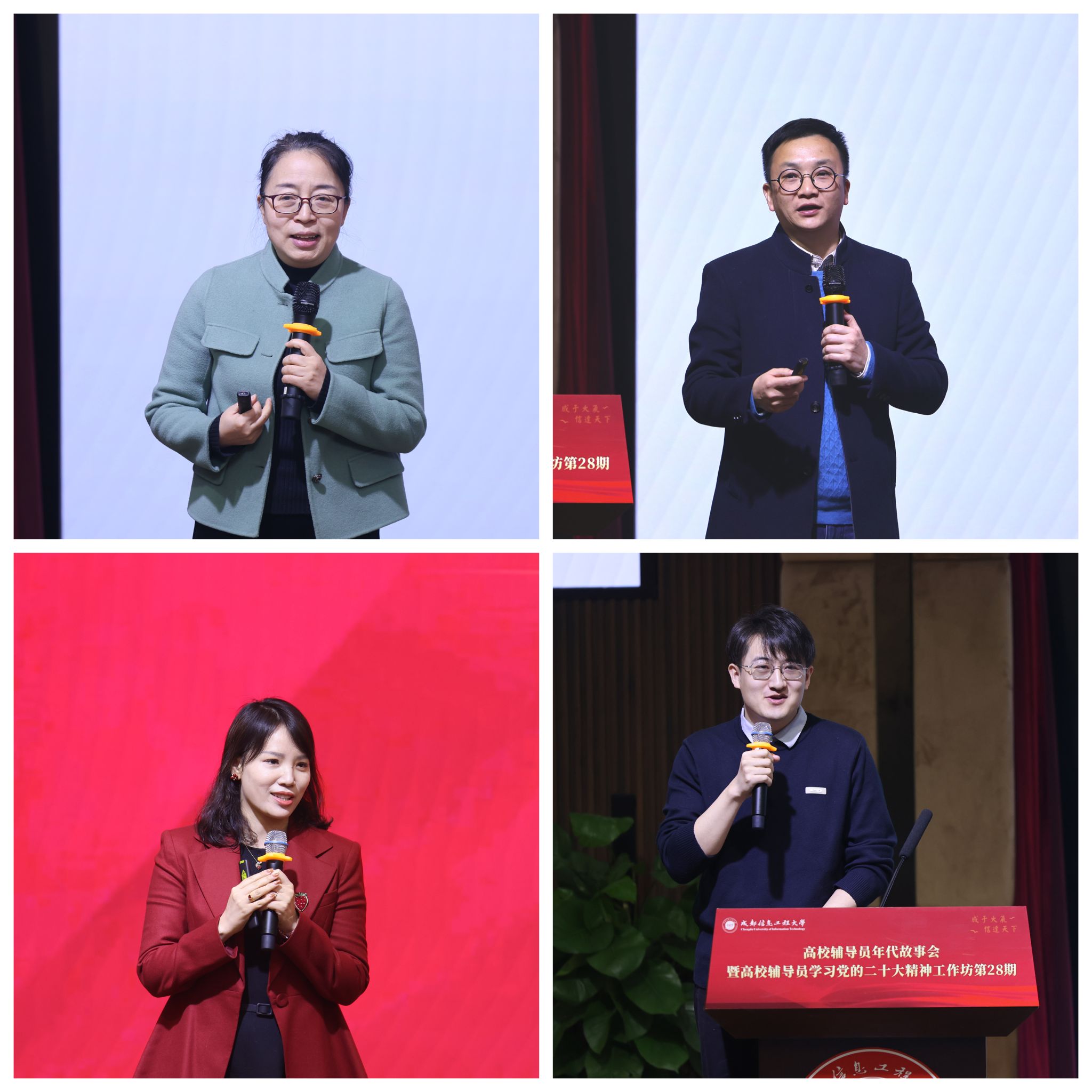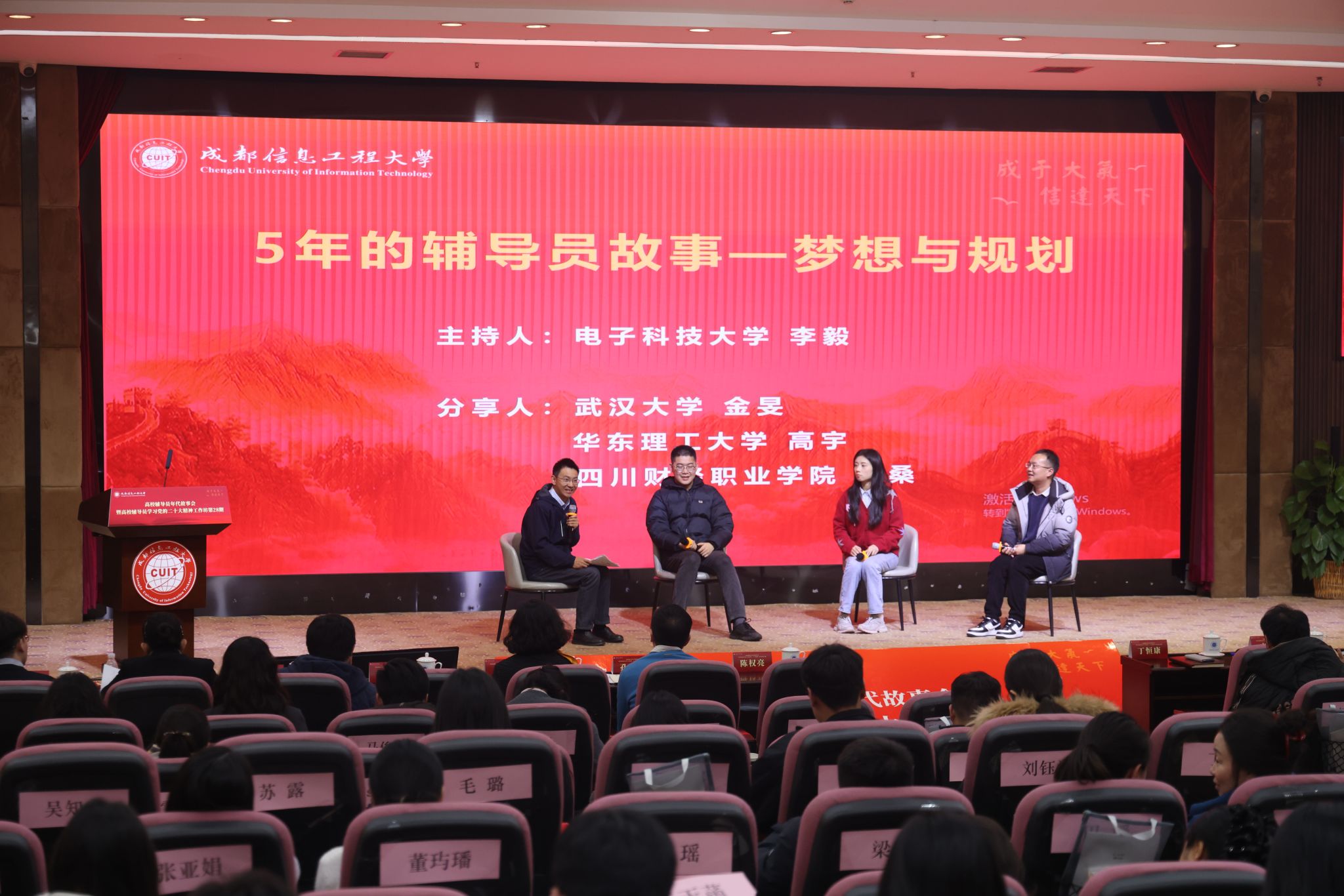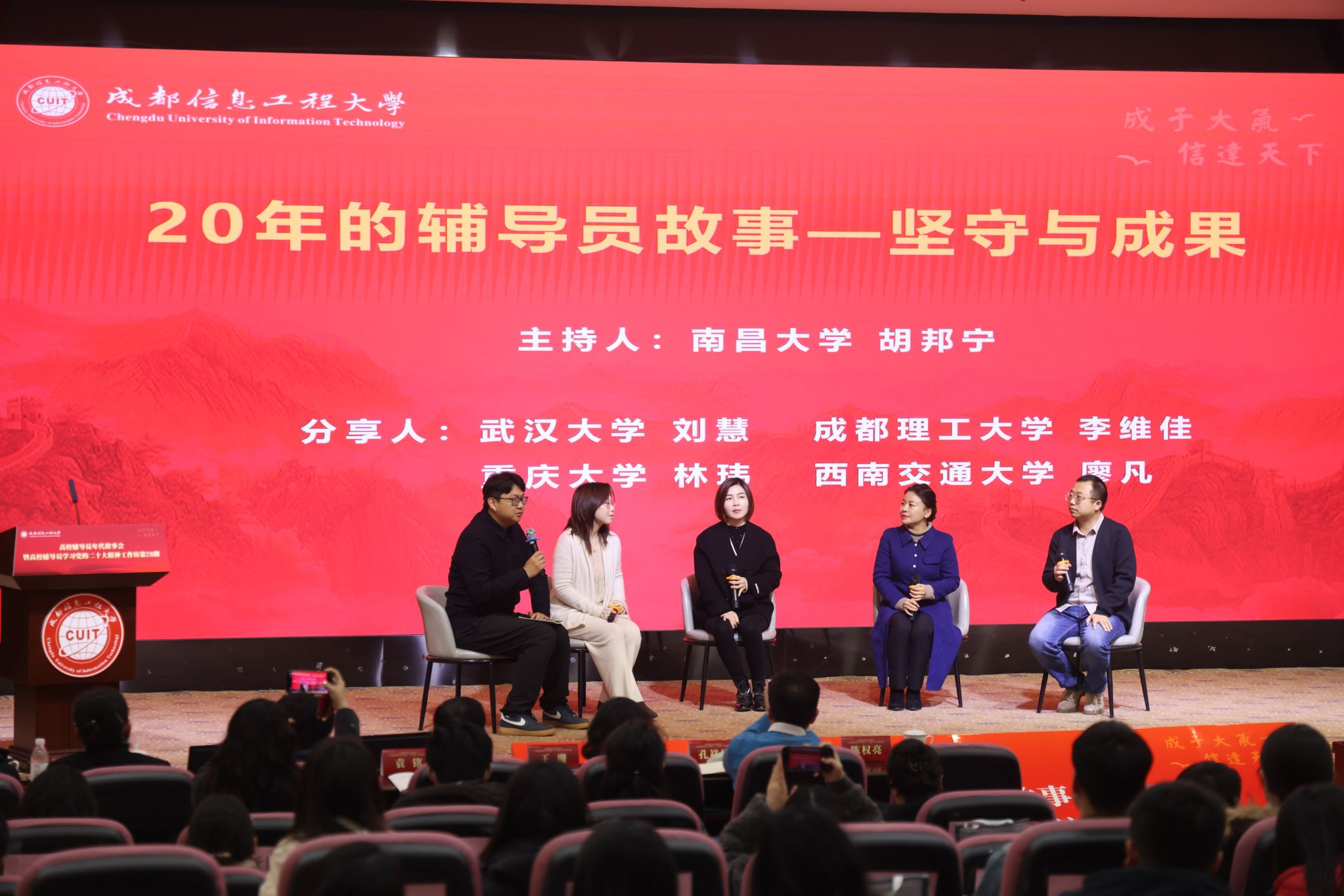 第四阶段题为“5年的辅导员故事——梦想与规划”,由电子科技大学光电科学与工程学院党委副书记李毅主持。山东大学辅导员陈冠廷以“活出有结构的生命”为题,讲述了年轻辅导员从迷茫到坚定的成长历程。武汉大学金旻、华东理工大学高宇、四川财经职业学院胡桑等围绕“梦想与规划”展开对话,展现了新一代辅导员的朝气、思考与担当。