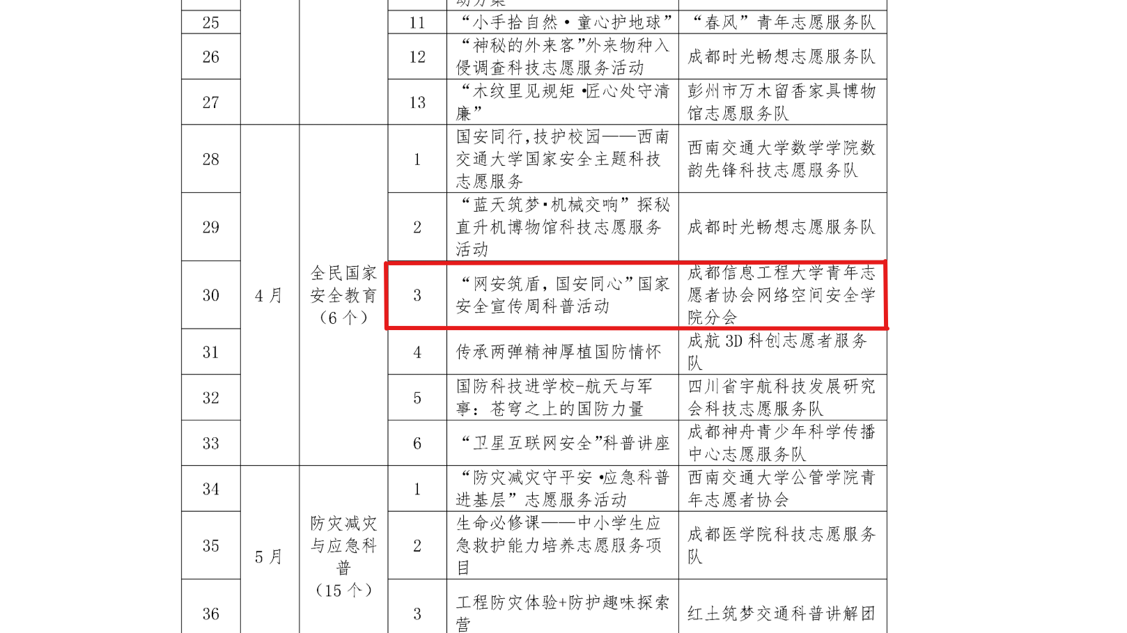 【本网讯】近日,成都市科学技术协会公布了2026年主题科技志愿服务活动申报结果,由校团委指导,网络空间安全学院团委牵头、青志协网安分会申报的“网安筑盾,国安同心”国家安全宣传周科普活动成功入选。