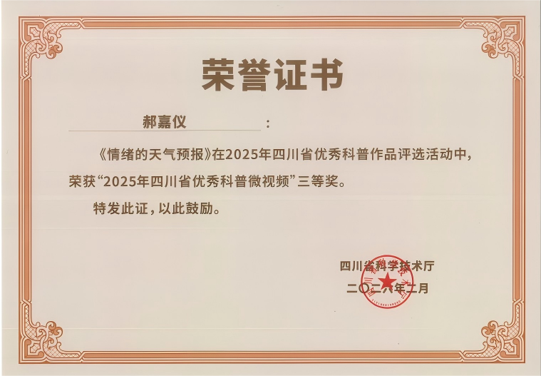 【本网讯】近日,四川省科学技术厅正式公布了2025年四川省优秀科普作品名单。在科技处的精心组织与统筹下,新莆京官网报送的科普作品在众多参赛项目中脱颖而出,其中由光电工程学院(人工影响天气学院)人工影响天气科普基地创作的科普微视频《情绪的天气预报》荣获2025年四川省优秀科普微视频三等奖。此次评选共遴选出优秀科普微视频49部,新莆京官网作品成功获奖,充分彰显了学校在科学普及与科技创新协同发展方面的扎实成效。