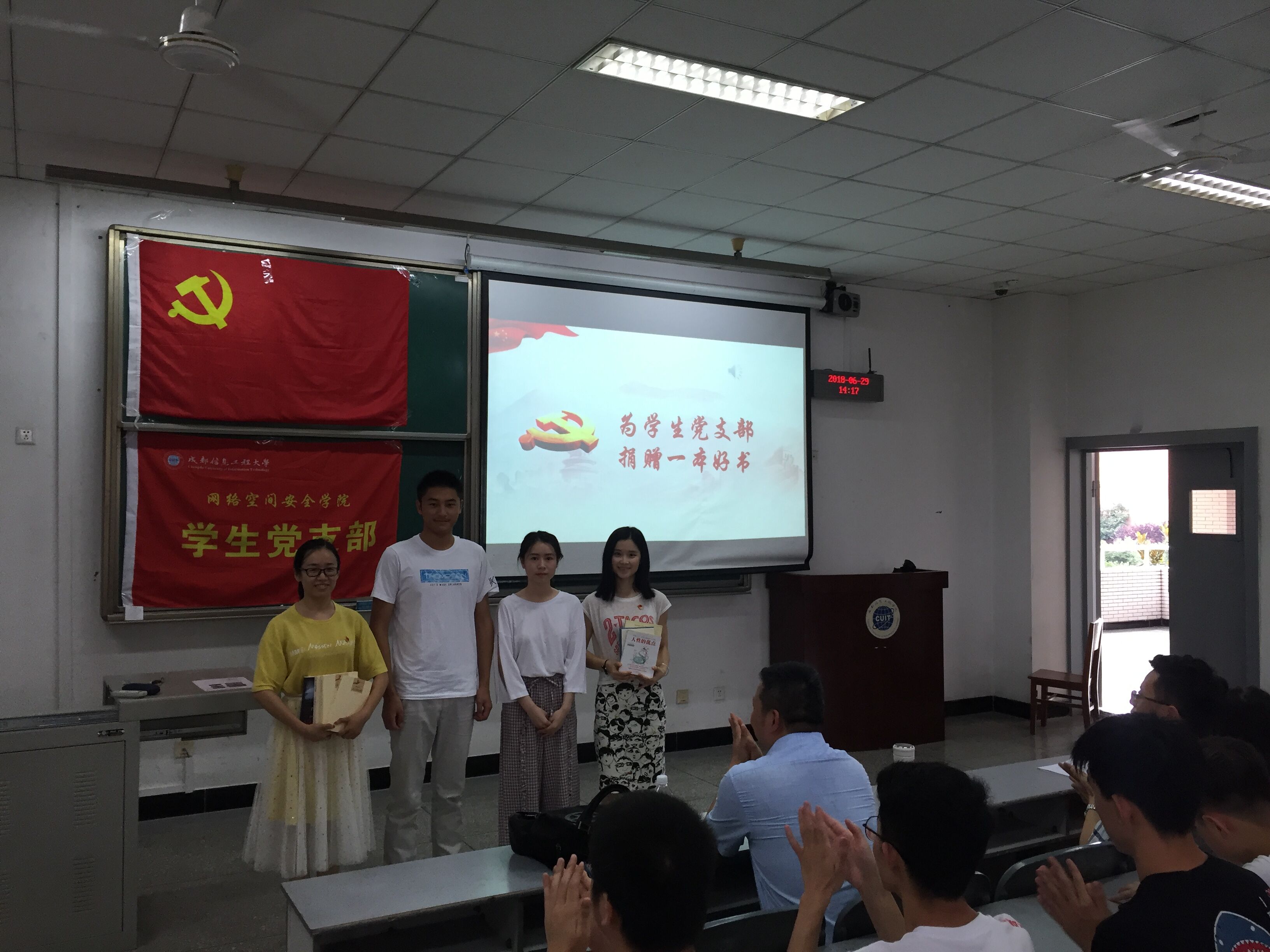 毕业生党员雷梨、郑维勇作为代表向学生党支部捐赠20本好书,通过捐献的一本本书籍,仍能让即将离校的学长学姐们同后来的学弟学妹们来一场跨越时空的交流。