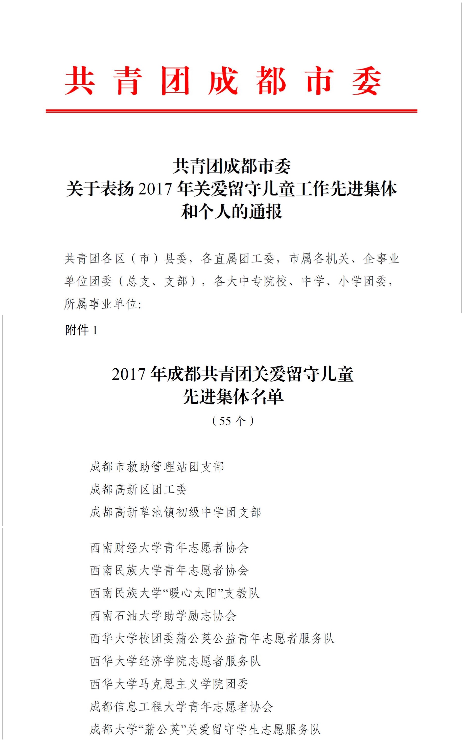 【本网讯】近日,共青团成都市委员会对2017年度农村留守儿童关爱工作先进集体及先进个人进行了表扬,新莆京官网青年志愿者协会被授予“2017年成都共青团关爱留守儿童先进集体”荣誉称号。此外,《2017暑期高校牵手乡村教育项目》《 “七彩假期·关爱成长”关爱青少年儿童项目》两个项目被评为“2017年成都共青团关爱留守儿童优秀项目”,沈能宇同学被评为“2017年成都共青团关爱留守儿童先进个人”。