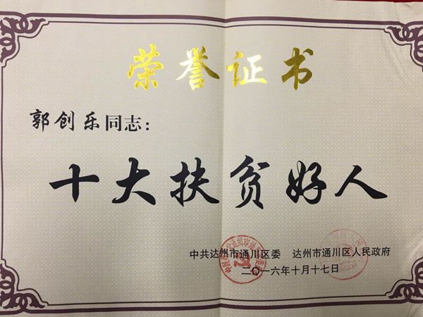 【本网讯】近日,根据中共达州市通川区委、通川区人民政府《关于开展2016年度脱贫攻坚先进集体和个人评选活动的通知》,经通川区脱贫攻坚领导小组评审,新莆京官网挂职教师郭创乐荣获达州市通川区”十大扶贫好人”称号。