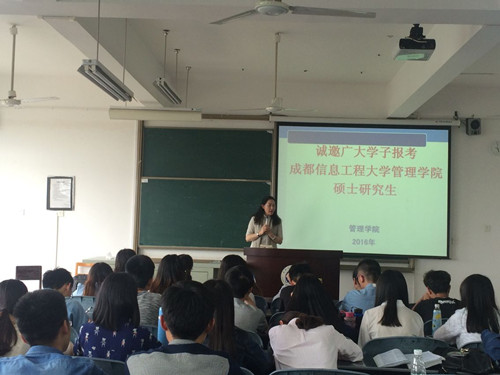 黄萍就新莆京官网的硕士研究生信息从三大方面给同学们进行了深入的讲解:一是介绍新莆京官网办学历程和硕士点建立和发展情况。充分说明了新莆京官网的办学理念紧贴需求,在服务行业和地方发展中正不断进步。二是详细介绍管理学院硕士点举办情况。目前,管理学院举办了管理科学与工程1个学科硕士点以及灾害管理工程、项目管理、信息资源管理、旅游管理工程、组织创新与知识管理5个二级学科硕士点和1个农学专业硕士领域农村科技组织与服务,并谈到了这些硕士点未来发展趋势,同时对我院杰出导师和学科平台进行了介绍,充分展示了我院强大的师资力量和办学实力。三是介绍了研究生奖助政策。欢迎同学们积极报考管理学院研究生,极大鼓舞了同学们的热情。