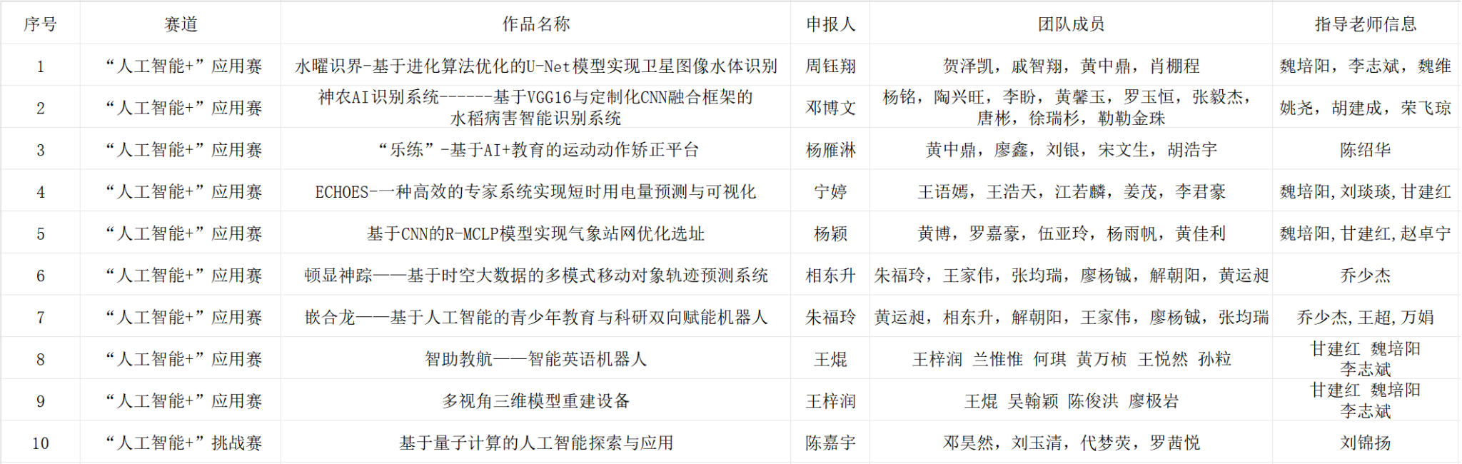 根据《关于开展第十九届“挑战杯”全国大学生课外学术科技作品竞赛的通知》等上级团组织工作要求,经过团队申报、学校审核,新莆京官网共10件作品拟推荐参加第十九届“挑战杯”全国大学生课外学术科技作品竞赛“人工智能+”专项赛,现对项目名单予以公示,名单如下: