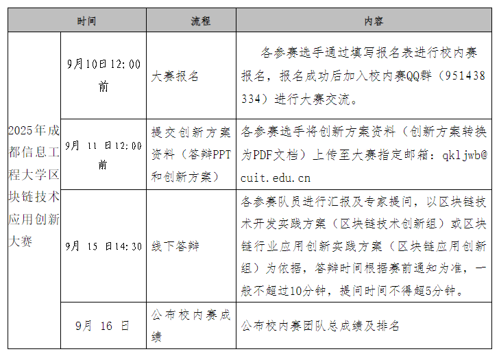 具体事项详见《2025年四川省大学生区块链技术应用创新大赛校内选拔赛竞赛方案和通知》附件。