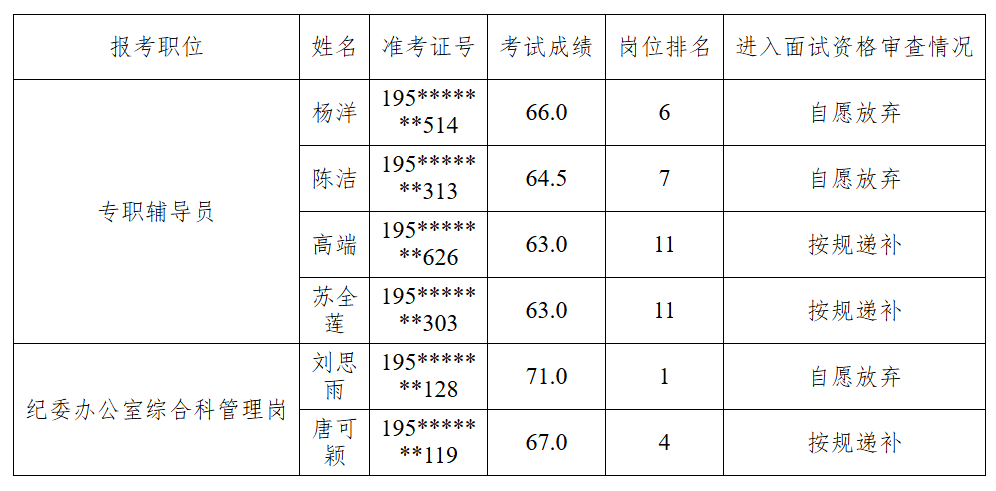 因本次公开选调中,专职辅导员岗2人,纪委办公室综合科管理岗1人,共3人自愿放弃面试资格审查,根据《新莆京3969关于2025年公开选调工作人员公告》,现递补3名考生进入面试资格审查,具体情况如下: