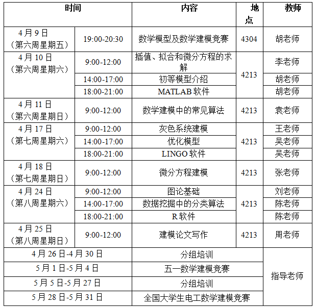 为了培养新莆京官网学生的创新意识及运用数学方法和计算机技术解决实际问题的能力,应用数学学院2021年继续组织和指导大学生数学建模竞赛系列活动,并从五一数学建模竞赛和全国大学生电工数学建模竞赛的获奖队伍中选拔2021年全国大学生数学建模竞赛的参赛队伍。为了参赛同学能在选拔赛中取得优异成绩,应用数学学院数学建模指导组从第六周开始,分别从数学建模基础、数学建模算法、数学建模案例分析以及常用数学软件等方面进行培训,欢迎对数学建模及数学建模竞赛感兴趣的同学积极参加培训,培训安排见表1。