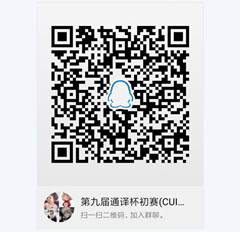 3. 学习委员于2019年11月28日(星期四)下午2:00点前将参赛同学本人签字确认后的纸质报名表交航空港校区第2教学楼4楼语言实验室办公室吴尧老师,并将报名表的电子文档发到“第九届通译杯初赛(CUIT外语学科竞赛)”报名群(扫右下二维码加群),以便信息核对。