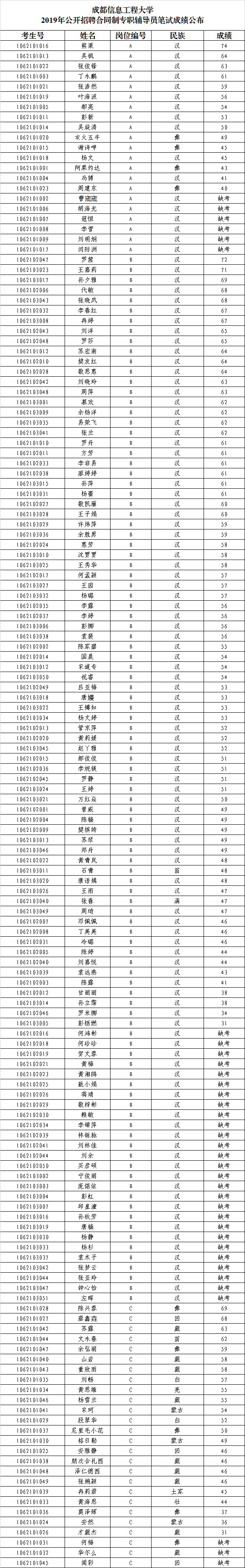 根据《新莆京39692019年公开招聘合同制专职辅导员公告》的安排,现将A、B、C岗笔试成绩及入围面试人员名单予以公布和公示。