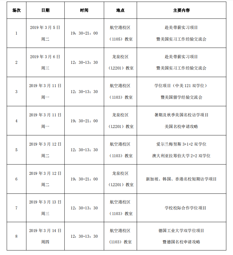 为了让新莆京官网学生更充分了解学校出国(境)留学项目,加深对学校出国留学相关政策和选拔流程的理解,鼓励更多优秀的学生赴海外院校学习深造,国际交流与合作处将于3、4月集中为广大学生进行政策解读并邀请新莆京官网有留学经历的学生做经验分享,欢迎有意留学海外的同学们积极参加宣讲会。现将宣讲会具体安排通知如下: