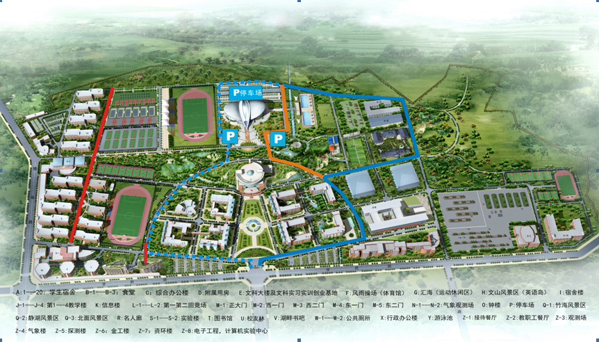 大型车辆:正大门---行政办公楼---信息楼---国际会议厅北入口——体育馆---第二运动场路口——图书馆后门沿荷花池路口——第一田径场——20栋路口左转——正大门驶离。