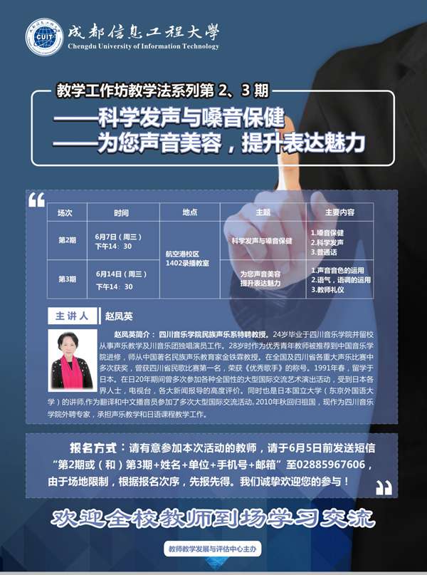 为帮助新莆京官网教师掌握科学发声与嗓音保健的技巧,提升表达魅力,学校教师教学发展与评估中心将开展两场“教学工作坊”教学法系列活动,我们诚挚欢迎您的参与!活动安排如下: