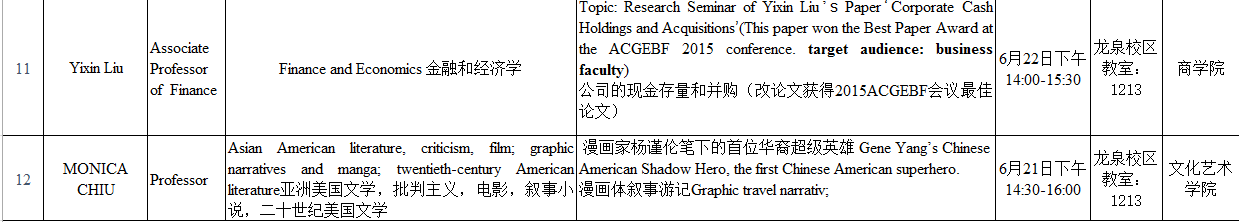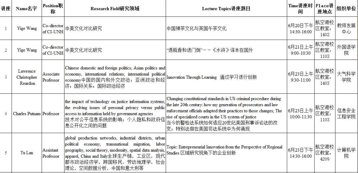 来自美国新罕布什尔大学的教授一行,将于6月20日至6月24日在新莆京官网开展12场讲座,时间和地点安排如下: