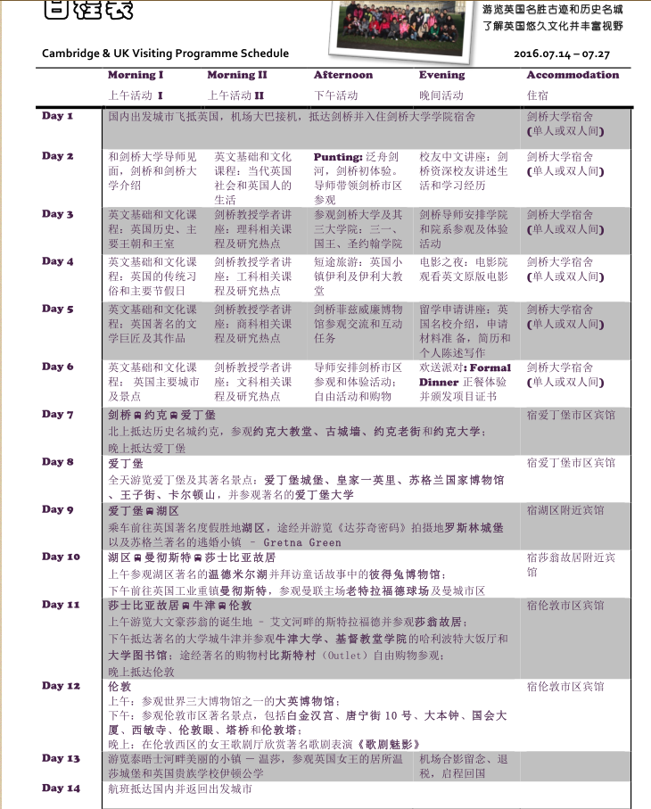 剑桥大学暑期海外课堂项目为期2周。参与该项目的同学将参加由剑桥大学教育专家设置的课程,全部课程由剑桥大学教授主讲,课程之外体验英伦文化(具体安排如下)。学生参与两个主题式社会调研与实践报告撰写,课程学习完成后将颁发结业证书。
