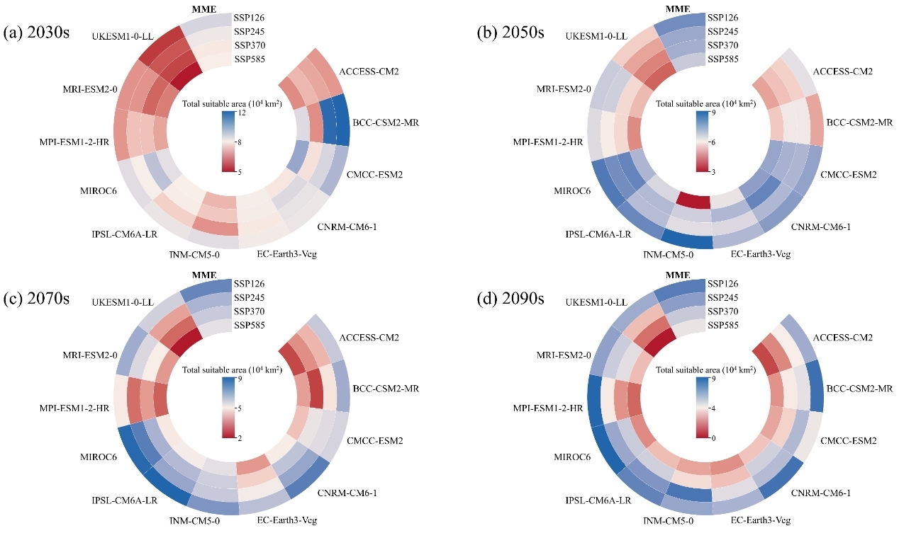 研究还评估了CMIP6气候模式的预测不确定性。不同的单一气候模式所预测的潜在适生区面积存在较大的差异,CMIP6-MME的预估结果更稳健地揭示了大熊猫潜在适生区在未来气候情景下可能的变化模式(图2)。