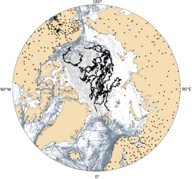 图1北极地区观测数据位置分布图。黑色线为NP观测路径(1979-1991年和2003-2012年),浅灰色线为IABP浮标观测(1979-2021年)路径,深灰色线为ICOADS观测(1979-2021年),陆地上黑色点为GHCN观测站点(1979-2021年)。