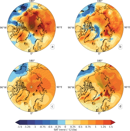 图2北极1979-2021年3月温升趋势,其中a为重建结果,b为ERA5,c为NASA GISTEMP v4,d为BerkeleyEarth。图中绿色点为通过显著性检验(P<0.05)。