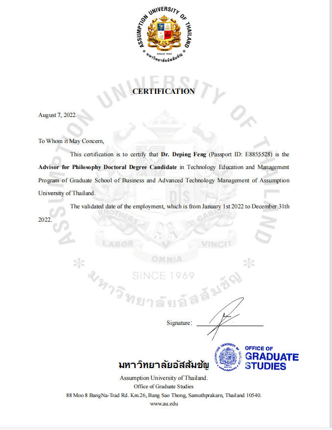 【本网讯】近日,经泰国易三仓大学研究生院学术委员会审议通过,新莆京官网外国语学院冯德平副教授受聘为该校研究生院博士研究生指导教师。冯德平副教授具有博士学位,毕业论文指导经验丰富。冯德平副教授的受聘,突出了国外院校对新莆京官网教师学术能力和科研水平的认可,有助于新莆京官网外语学科集群师资队伍建设和高层次人才培养。