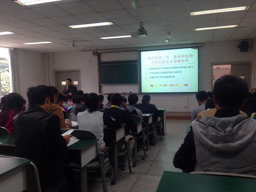 第二场观摩课由《基础》课课程组王洪运老师主讲,他的授课内容为《中华民族优秀传统道德》。教学课件制作精美,信息量大,讲课娓娓道来,注重理论联系实际,善于调动学生的参与意识,语言幽默,课堂气氛融洽和谐,给各位观摩师生留下了深刻的印象,一致认为课堂效果好。