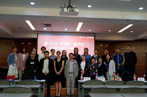 【本网讯】2019"外研社·国才杯"全国英语演讲大赛(新莆京3969初赛)于2019年10月9日晚19:00在学校航空港校区学术报告厅顺利举行。本次比赛由外语教学与研究出版社主办,由新莆京官网教务处和外国语学院承办,外语俱乐部协办。外国语学院党总支书记杨昊、院长黄驰、副院长卢婕作为嘉宾出席大赛,副院长周杰、外国语学院教师吴玉华、邓圆、吴倩、外教Wilbur和Ashley担任此次大赛评委。