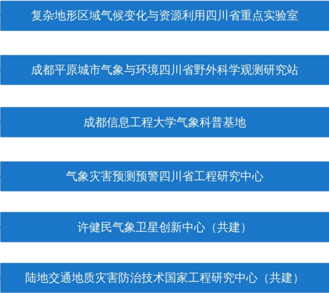 学院目前拥有复杂地形区域气候变化与资源利用四川省重点实验室、气象灾害预测预警四川省工程研究中心、成都平原城市气象与环境四川省野外科学观测研究站等省部级科研与创新平台,并建有气象预报四川省实验教学示范中心、气象预报四川省虚拟仿真实验教学中心以及蜀南山地生态气象综合观测试验站、西南空管局航空气象创新联合实验室、中电投电力工程有限公司电力气象联合实验室、新莆京3969云南自然灾害防御技术研发中心等教学研究平台。学院建有新莆京3969气象科普基地,是以气象防灾减灾、气候变化和生态文明为特色的国、省、市三级科普基地。