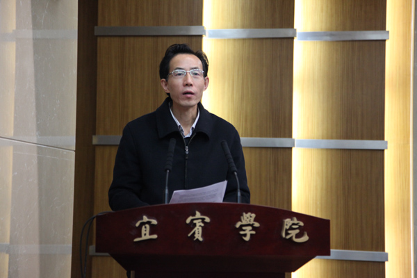 宜宾学院党委书记屈川致欢迎辞。他向来宾简要介绍了宜宾的历史文化、宜宾学院的办学特色与取得的成绩,并从队伍建设、学科建设、科学研究、教学改革等四个方面介绍了宜宾学院思政理论课建设的特色与成绩。